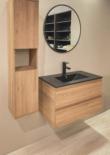 Baño moderno con mueble flotante de madera, mesada negra con bacha integrada, grifería negra mate y espejo circular con marco negro.