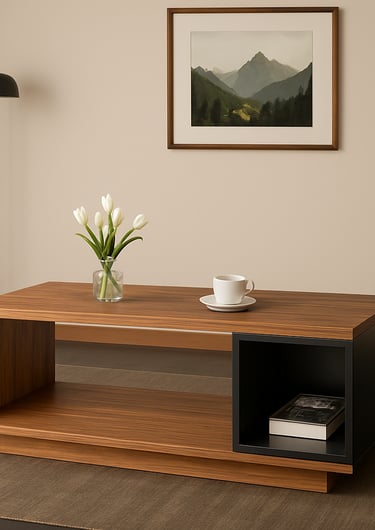 “Mesa ratona moderna en madera y metal, con un diseño minimalista que aporta calidez y elegancia al ambiente.”